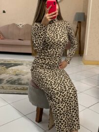 پیراهن ماکسی یقه اسکی آستین بلند پلنگی_کد1039